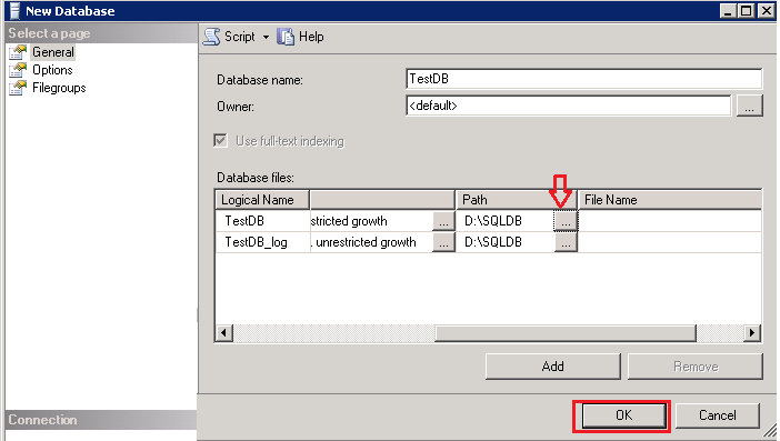 When you create new SQL Server Database, both Primary data file and Log file of the database will be created under default sql server location (C:Program FilesMicrosoft SQL ServerMSSQL.1MSSQLDATA). Since most of the applications are using C drive location to store their required files, we can not ensure the availability of free space in future for growing database. So better idea is create new SQL Database files in a dedicated location that has more free space availability without any other disturbance. You can easily create new sql server database in different location using SQL Server Management Studio.
