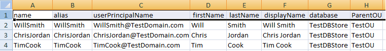 1. Consider the CSV file MailboxUsers.csv which contains set of new exchange mailboxes to create with the attributes name, alias, userPrincipalName, database, firstName, lastName, displayName and ParentOU.